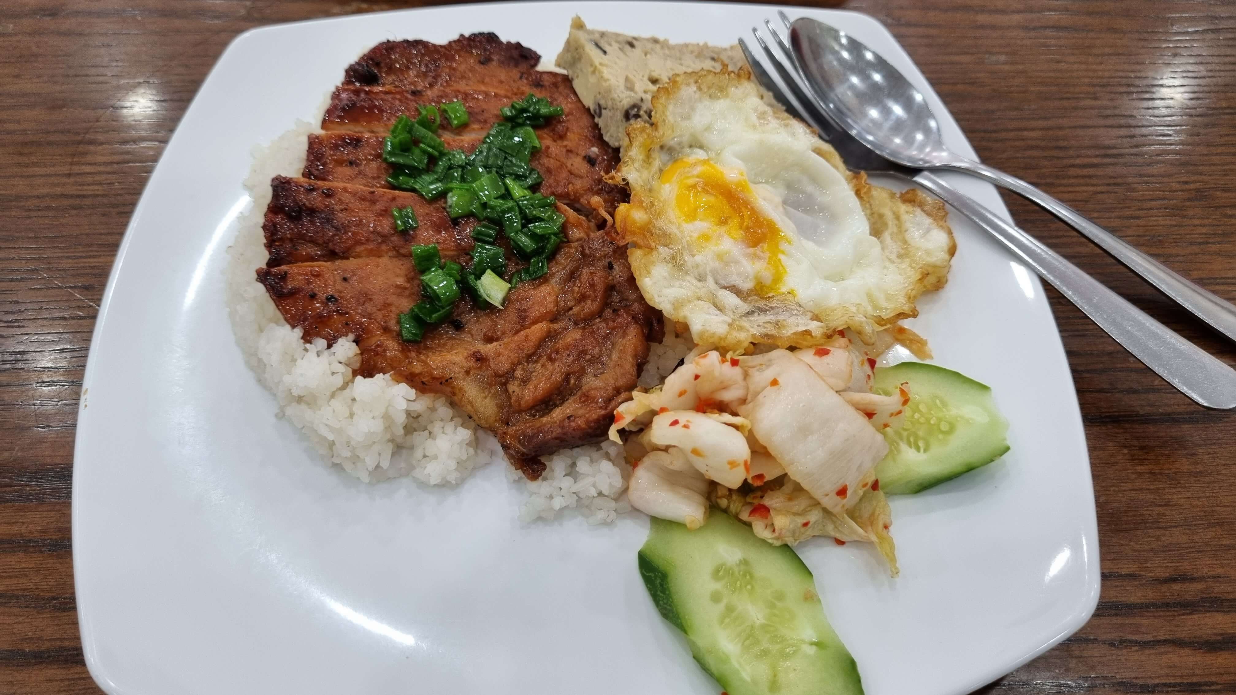 껌땀은 밥과 고기, 계란프라이, 생오이, 김치(처럼 보이는 야채무침), 계란찜(?) 같은 반찬이 나옵니다. 여기에 미역국(미역이 아닌 것 같긴 한데) 맛이 나는 국이 추가로 나옵니다.