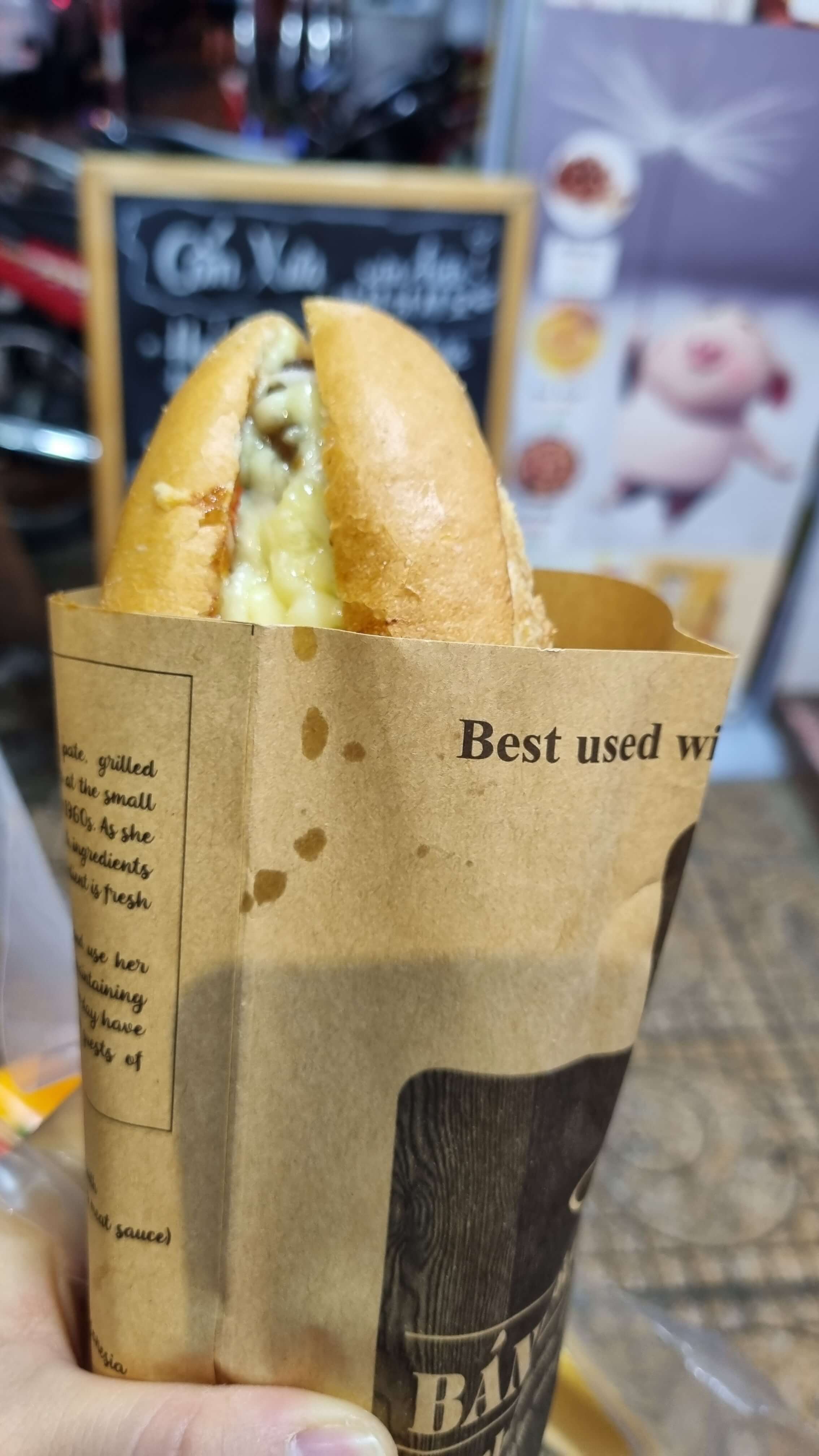 가게 안에는 한국어로 메뉴판이 나와있어 주문하기 쉬웠고, 한국인들에게 가장 인기 있는 메뉴인 소고기 치즈 반미를 주문했습니다. 소고기 치즈 반미는 40,000동이었는데 베나자 카드 할인 10%를 받아서 36,000동(약 1,950원)이었습니다. 2월 기준 가격이 조금 오른 것 같습니다.(45,000동) 소고기 치즈 반미 맛은 갓 나와 따끈따끈한 빵에 피자 치즈가 올라와 있어 다른 반미보다 고소하고 짭조름한 맛이었고, 안에 들어간 소고기도 고기의 잡내가 없이 깔끔한 맛이었습니다. 가장 맛있게 먹는 것은 나오자마자 그 자리에서 한입 베어 물었을 때가 가장 맛있었습니다.우리나라에서 반미 샌드위치 하나에 7,000원 정도 하는 걸 생각하면 굉장히 저렴하면서도 한 끼 식사로 손색없을 정도로 든든했습니다.