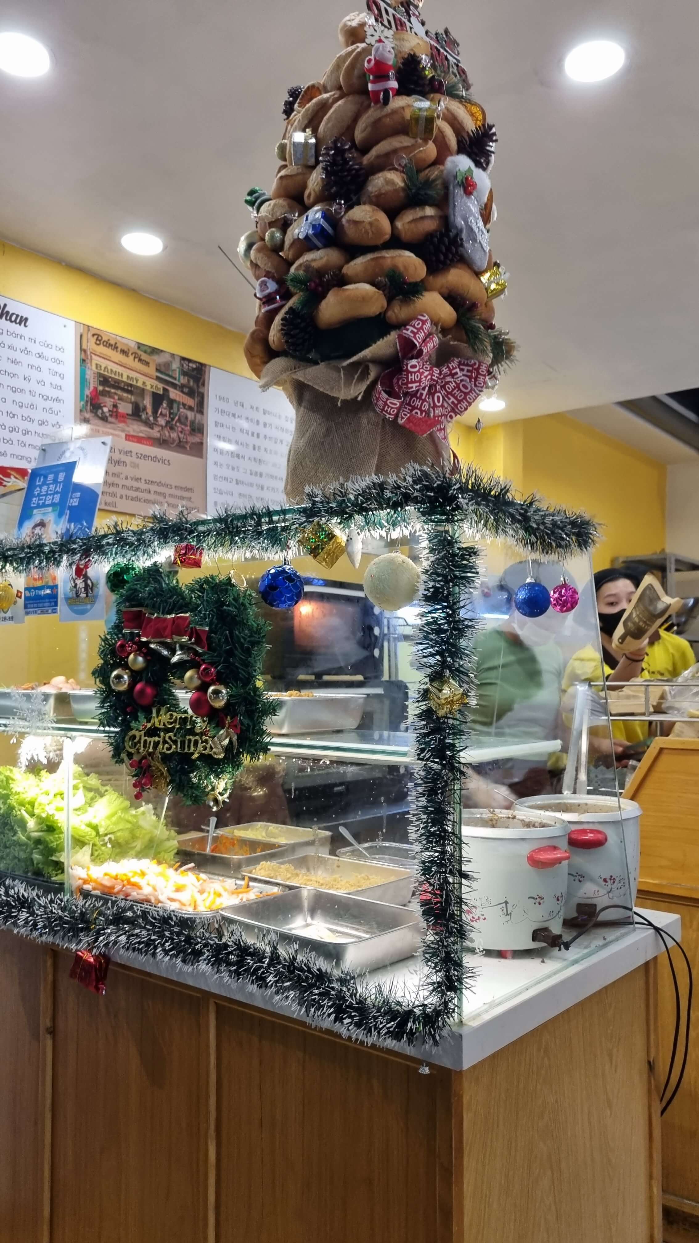 저는 크리스마스 기간에 방문을 해서 반미로 크리스마스트리를 장식한 모습도 볼 수 있었습니다. 저녁시간임에도 사람들이 바깥까지 줄을 서있었고, 안쪽에서 대기할 수 있는 의자도 마련되어 있었습니다.