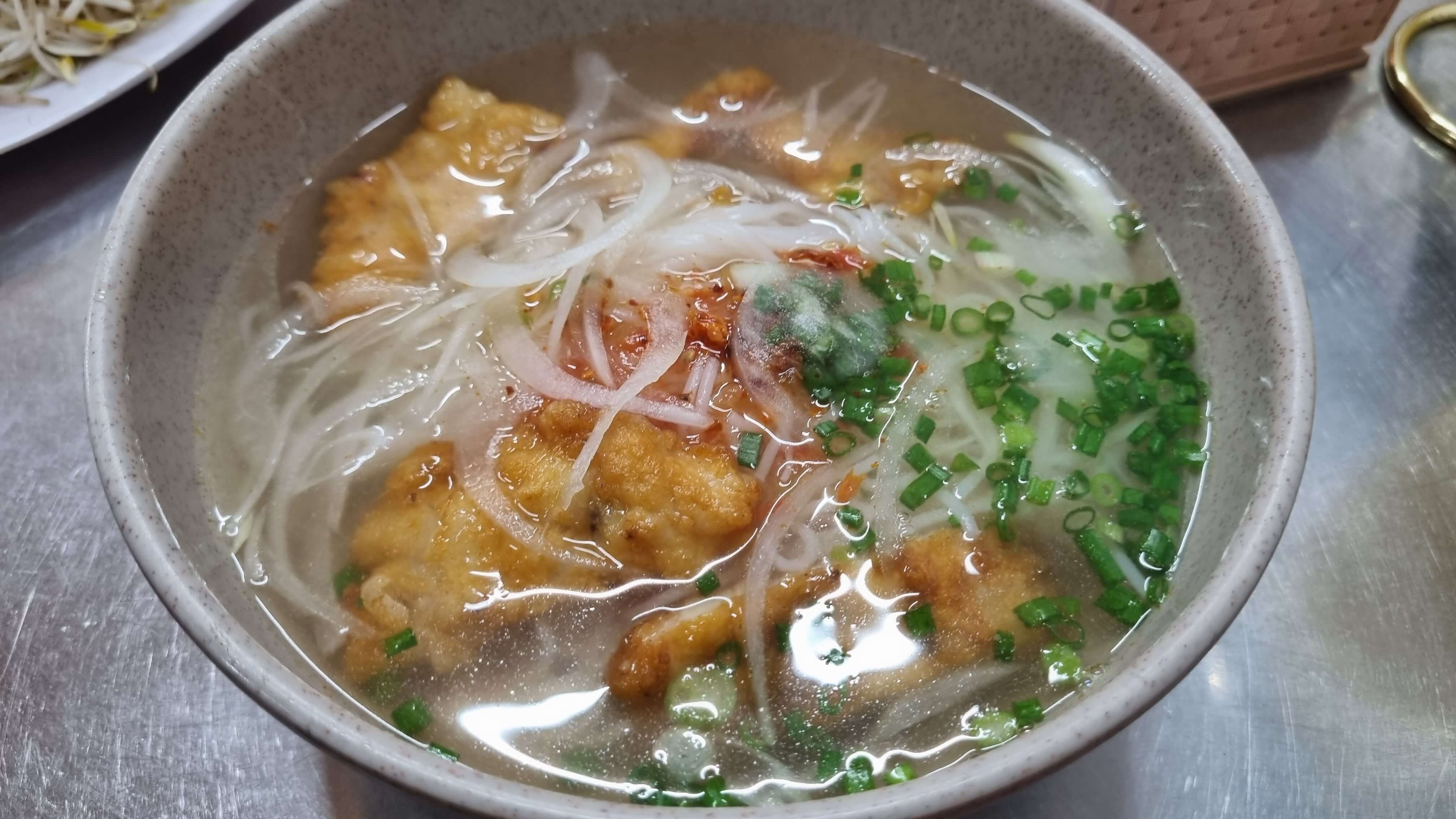 오징어 어묵 쌀국수 국물을 맛보면 소고기 육수 쌀국수보다 국물이 훨씬 깔끔하고 시원합니다. 국물 자체에 고춧가루로 양념이 되어 있어서 국물을 마시면 살짝 칼칼한 느낌이 들지만 매운 정도는 아닙니다. 면은 얇은 면이라 후루룩 먹기 쉬웠고, 숙주와 야채들은 접시에 따로 올려져 있어서 필요한 만큼 넣어 먹으면 됩니다. 육수에 들어간 오징어 어묵은 한국에서 쉽게 먹어 볼 수 있는 해물 핫바맛입니다. 갓 튀겨 나와 따끈따끈한 어묵이라 조심조심 드셔야 합니다.