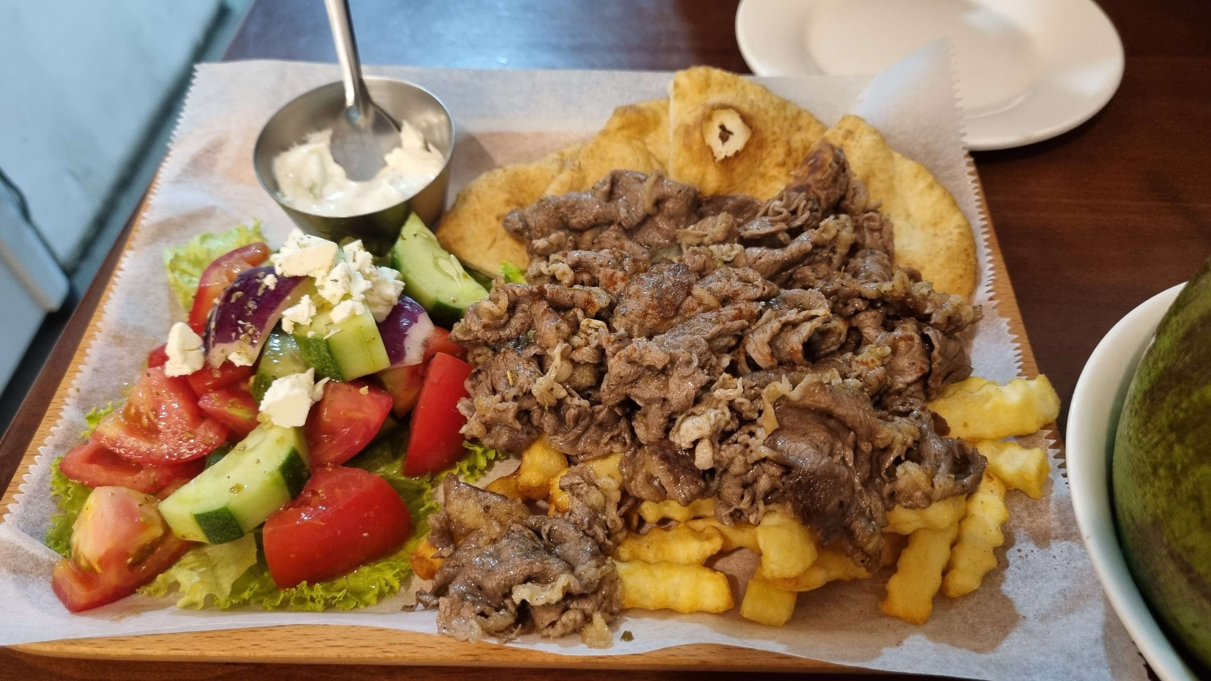 수블라키 플레이트는 피타라는 빵이 밑에 깔려 있어서 빵 사이에 직접 고기와 야채를 넣고 요거트 소스에 찍어 먹으면 됩니다. 우선 튀기고 볶는 음식과 다르게 기름기 적고 담백한 음식을 먹는 것에 만족스러웠습니다. 음식은 갓 나와서 엄청 뜨거웠고, 같이 먹는 채소들도 신선하고 요거트와도 잘 어울렸습니다. 빵 자체는 크게 맛이 나지 않지만 고소하고 담백한 맛이었고, 고기도 강한 양념이 아니라 고기 본연의 맛을 느낄 수 있을 정도로 간을 약하게 했습니다. 재료들을 따로따로 먹어도 괜찮았지만 피타 빵에 싸서 한꺼번에 같이 먹으니 훨씬 좋았습니다.