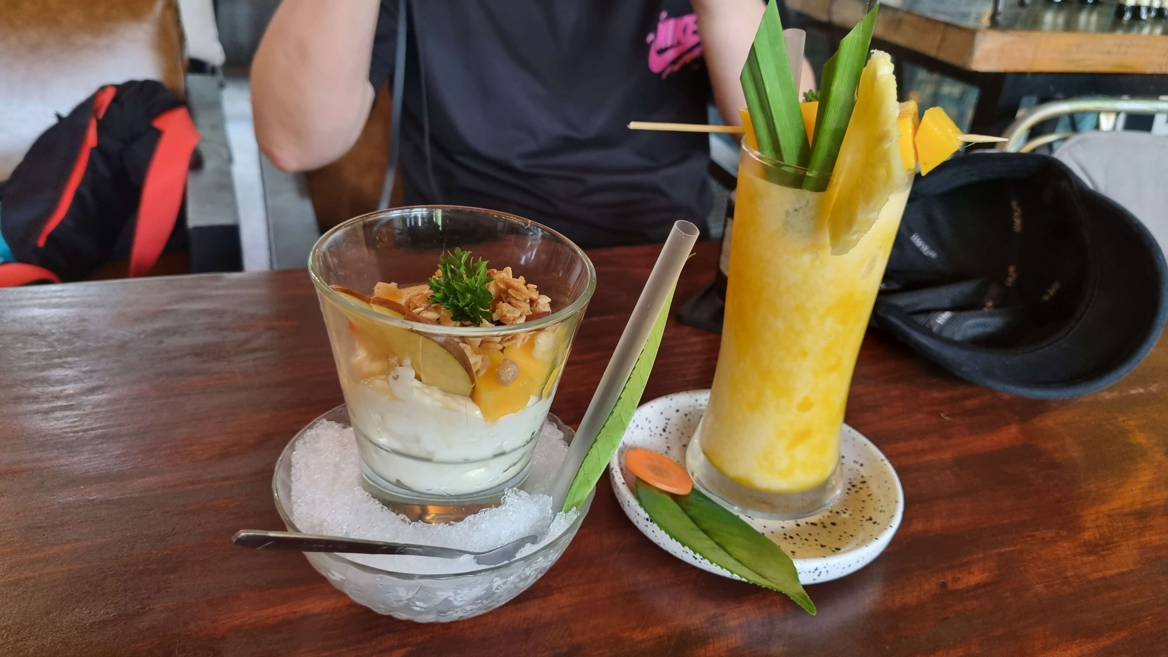 음료는 과일 요거트와 망고 파인애플 스무디를 시켰는데 요거트는 알갱이가 씹히는 것처럼 몽글몽글한 식감이었고 너무 묽지 않고 약간 꾸덕한 느낌이었습니다. 안에 들어간 과일들과 섞어 먹으니 새콤 달콤해서 맛있었습니다. 망고 파인애플 스무디는 달달한 망고와 새콤한 파인애플이 만나 상큼한 느낌이 들었고, 갑자기 찾아온 더위에 기운이 나는 맛이었습니다. 저는 다음 번에도 이 메뉴 그대로 주문할 것 같습니다.