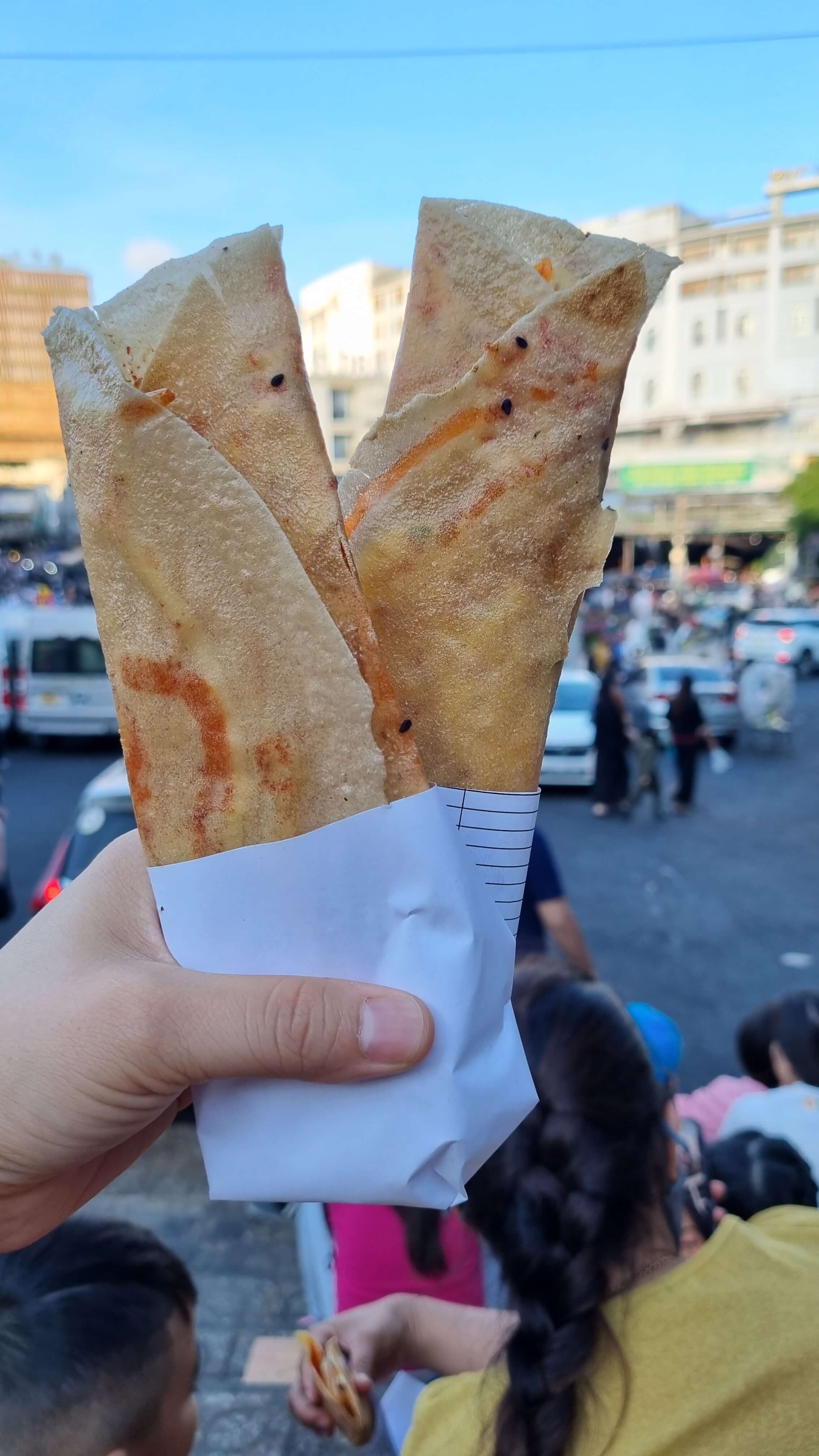 - 반짱느엉을 주문하고 계단에 앉아 기다리면 아저씨께서 직접 가져다주십니다.. 바삭하게 구운 라이스페이퍼에 새콤한 소스와 소시지와 새우가루 맛이 나는 과자 느낌의 음식입니다. 계단에 앉아 바쁘게 움직이는 오토바이와 수많은 사람들을 구경하며 반짱느엉을 먹는 맛이 별미입니다. 가격이 저렴해서 야시장에서 한번 드셔보기를 추천드립니다.