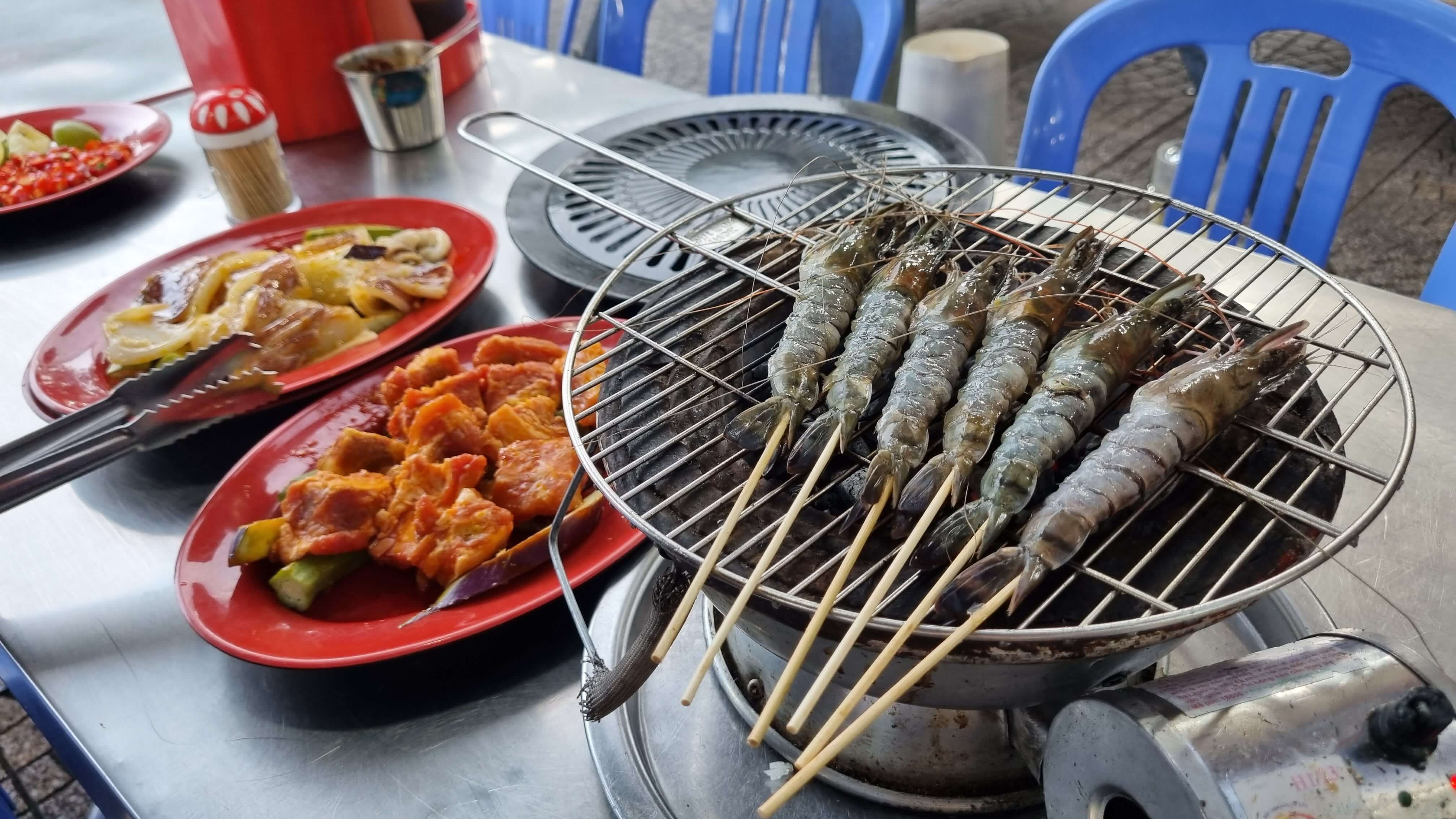 - 팔고 있는 음식은 새우, 소고기, 오징어등 육류와 해산물 구이이고, 그 외에 볶음밥이나 모닝글로리 등의 식사류를 팔기도 합니다.