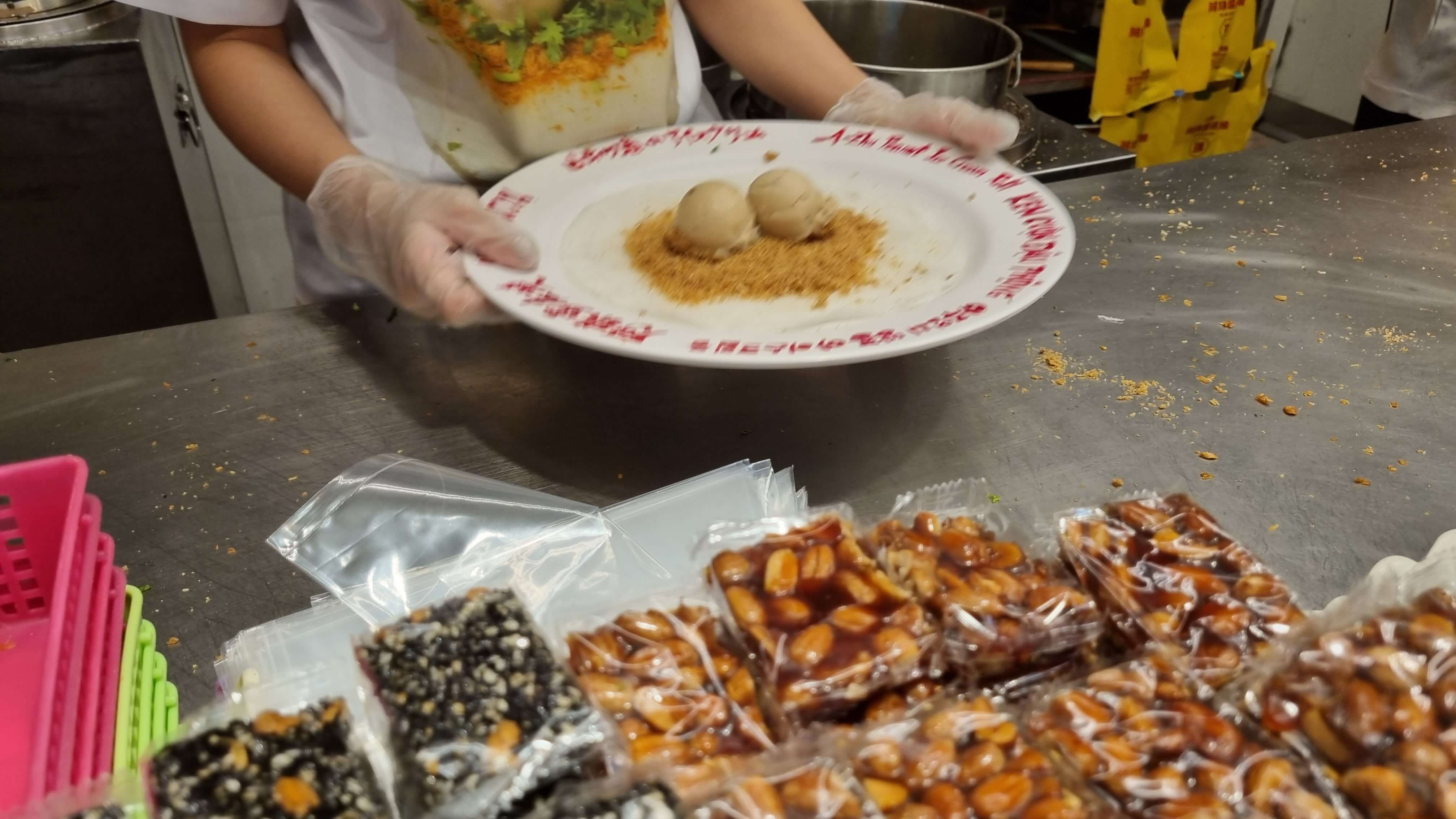 - 땅콩 아이스크림: 얇은 전병위에 땅콩 가루와 아이스크림을 올리고 돌돌 말아 잘라줍니다. 커다란 땅콩엿을 가는 모습도 볼 수 있습니다. 맛은 고소한 땅콩 아이스크림 맛입니다. 고수를 넣어주니 빼달라고 이야기를 하시기 바랍니다.