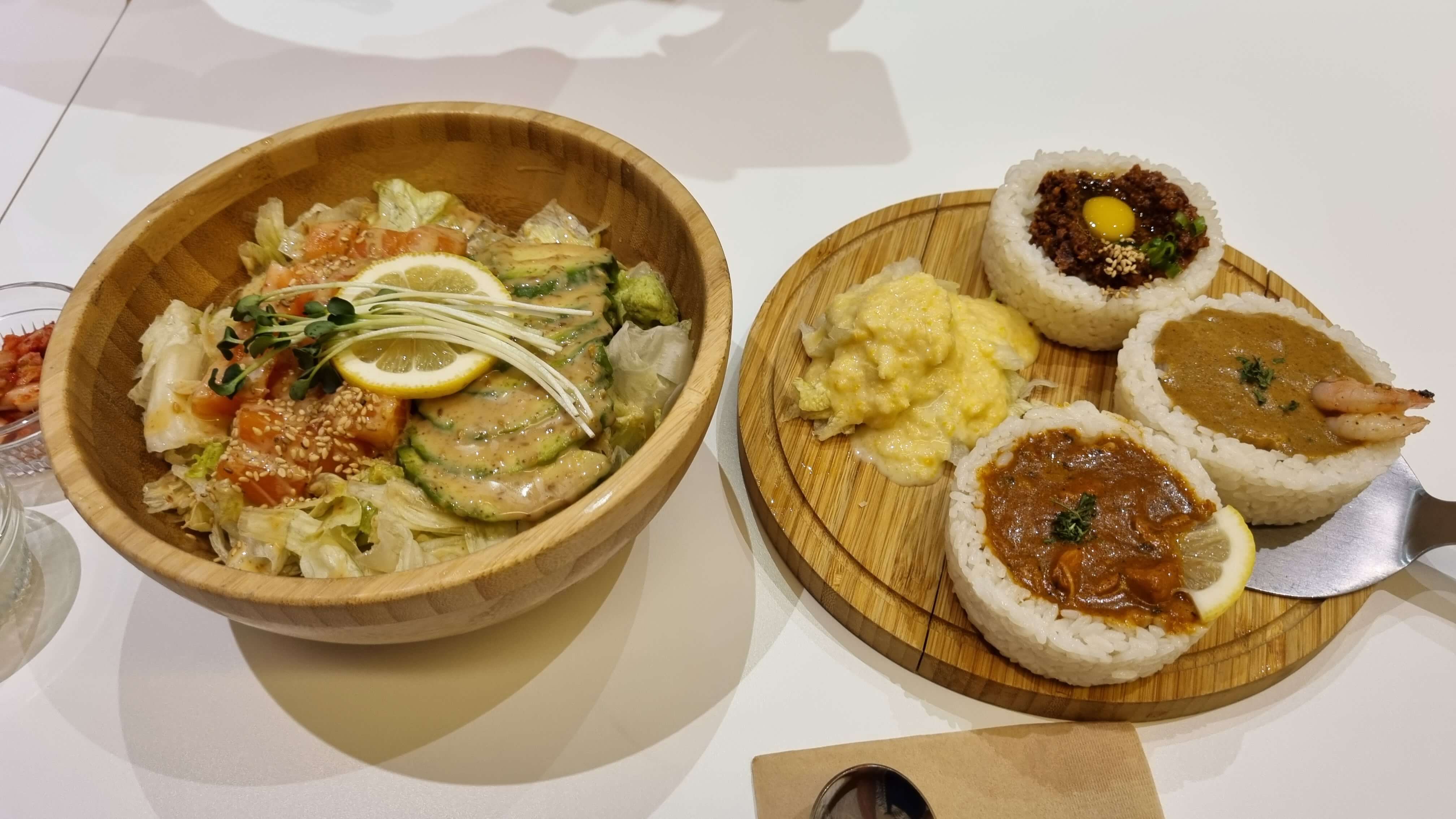 • 시그니처 메뉴는 그릇 모양의 밥에 세 가지 종류의 카레를 한 번에 맛볼 수 있는 소코아 카레입니다. 저희는 소코아 카레와 아보카도 연어냉우동을 주문했습니다.