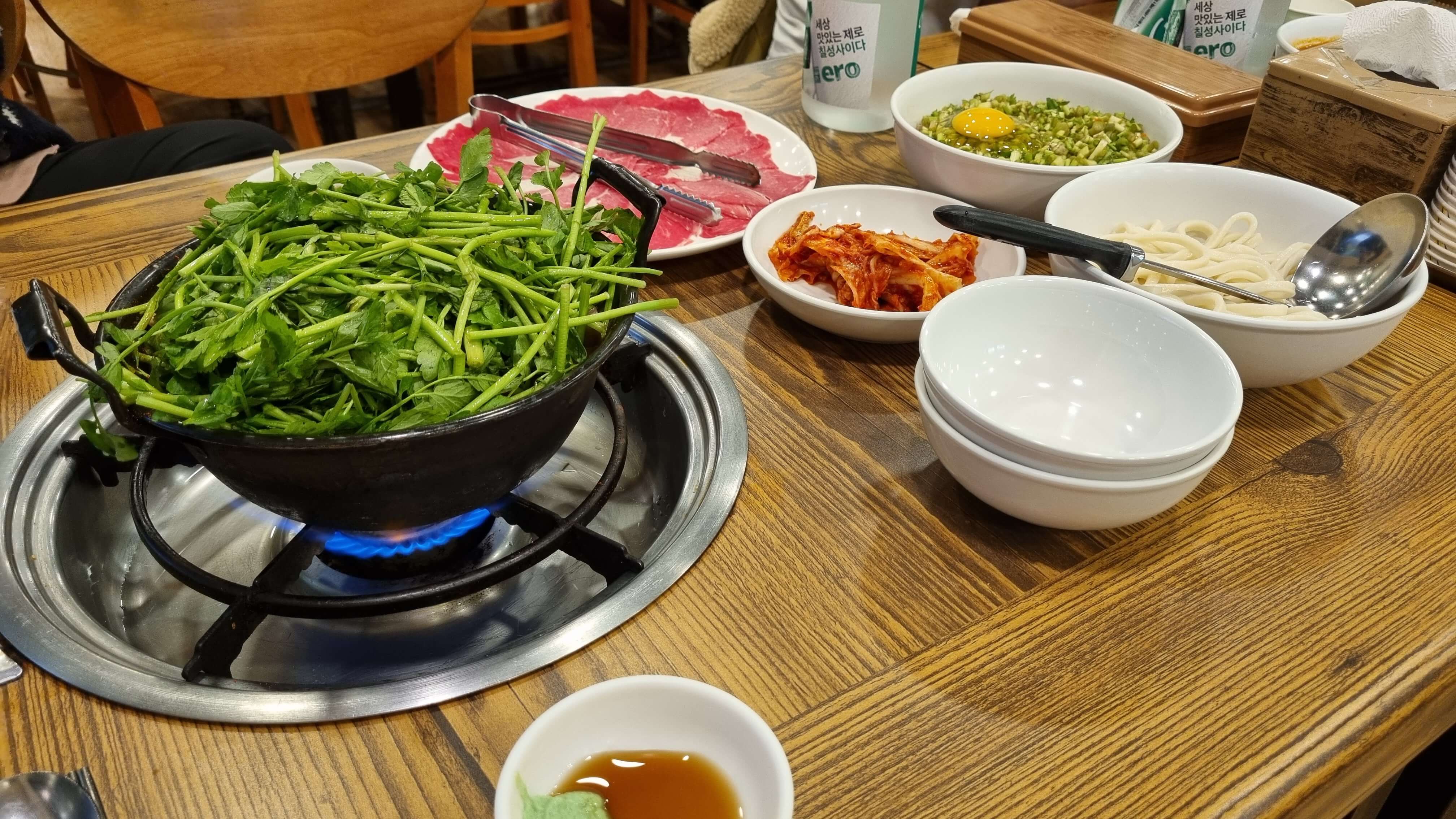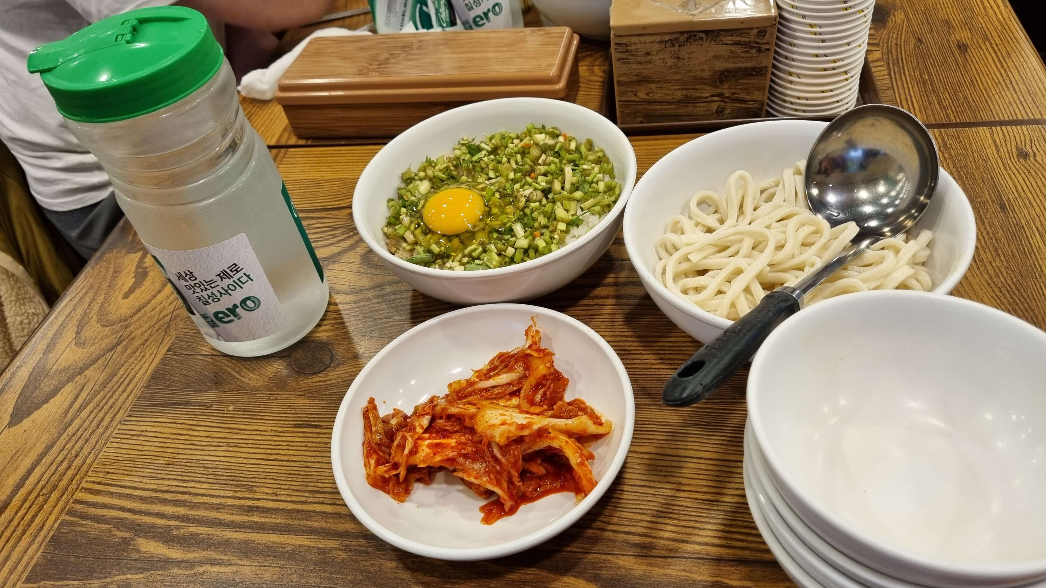 야채와 고기를 어느정도 먹고 나면 바로 칼국수 면을 넣습니다. 칼국수면은 시중에서 파는 칼국수 면처럼 납작하지 않고 우동사리면 정도의 두툼함을 가지고 있습니다. 밀가루 묻힌 면이 아니고 수분 가득한 생면이 나오는데, 그래서인지 면이 금방 익었습니다. 면은 쫄깃하고 탱글한 식감이었고, 이로도 쉽게 잘렸습니다.