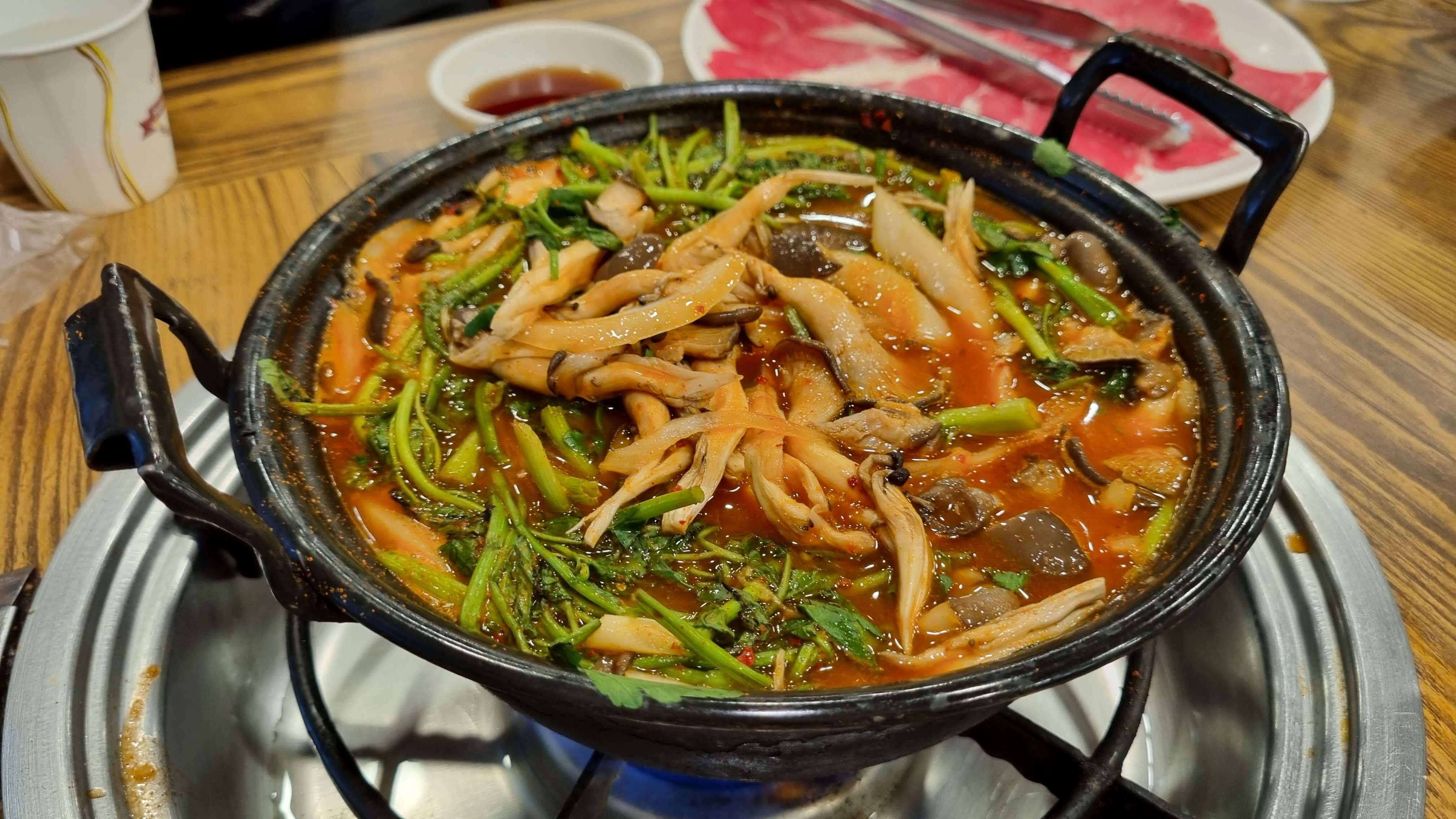 신선한 미나리와 버섯을 먹다가 샤브샤브처럼 고기를 넣어 먹습니다. 고기는 잡내도 나지 않고 미나리, 버섯과 함께 먹기도 좋았습니다.
